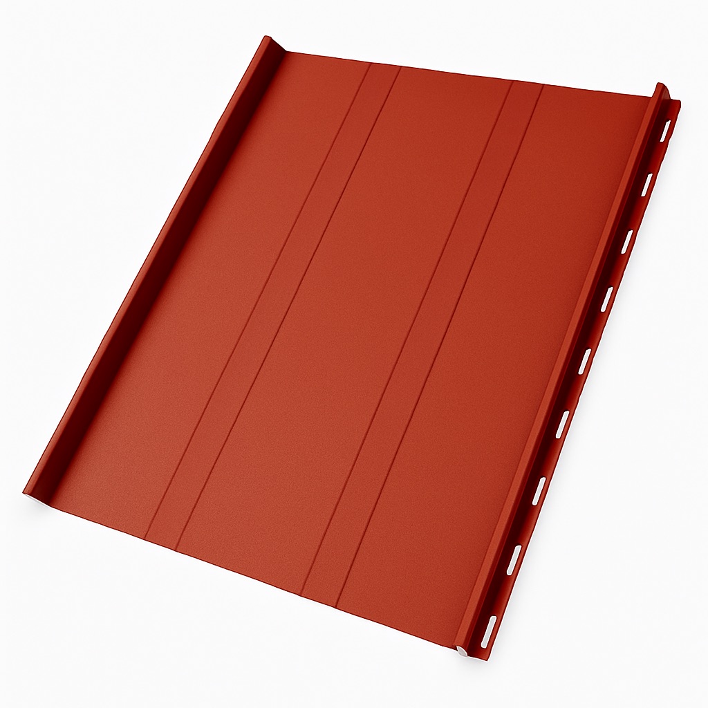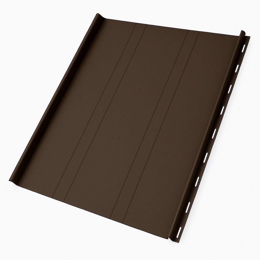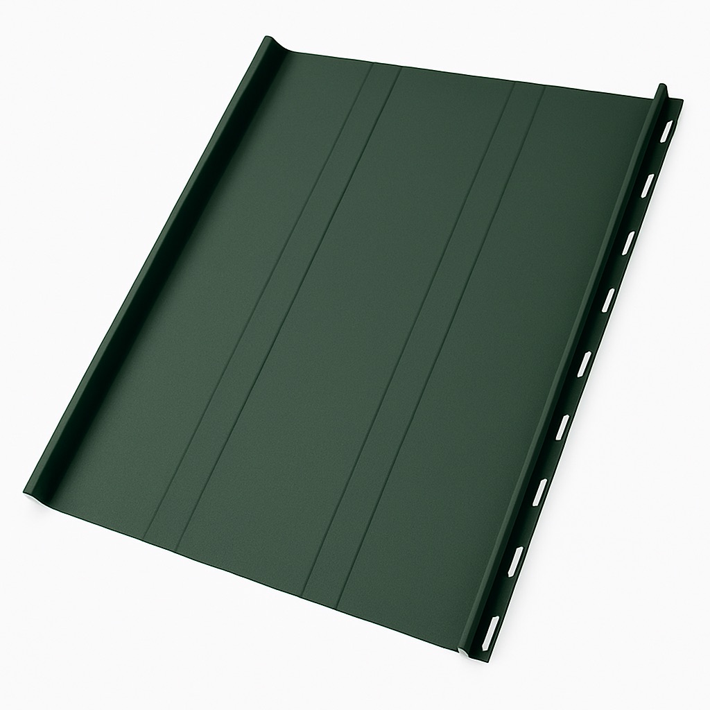 Заводские торцевые заглушки и стартовый загиб упрощают монтаж и повышают надежность покрытия, защищая торцы панелей от влаги, мусора и деформаций. Такая кровля отличается долговечностью (более 30 лет), легкостью конструкции и аккуратной геометрией панелей, создавая современный и дорогой внешний вид крыши.